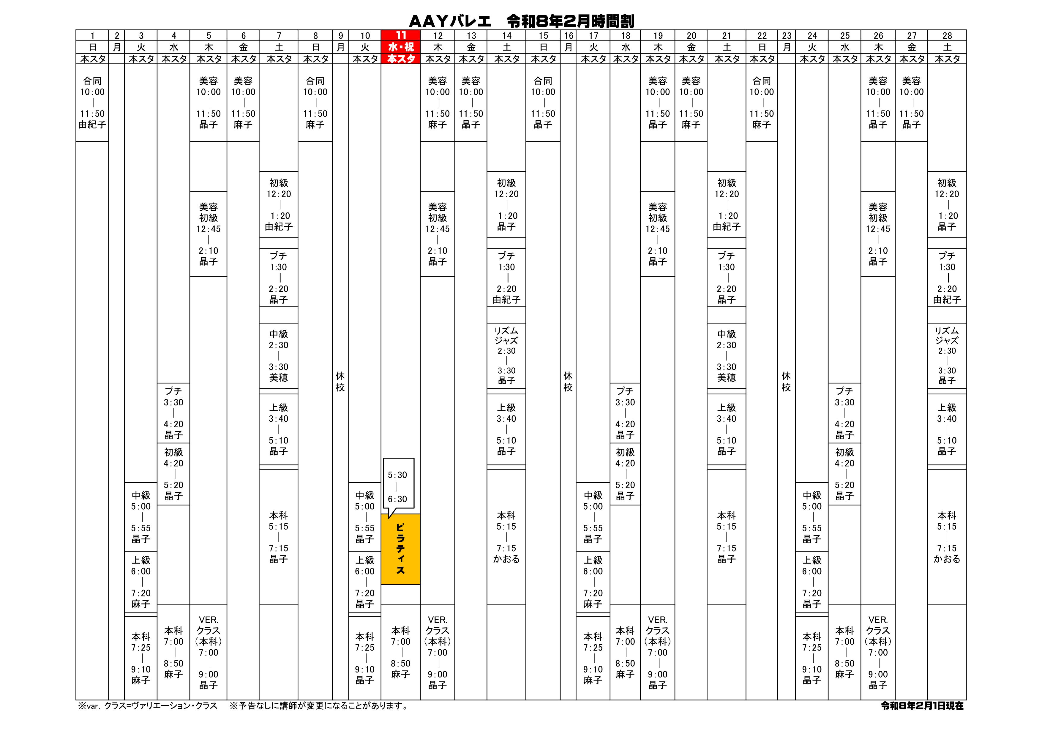令和8年2月時間割表